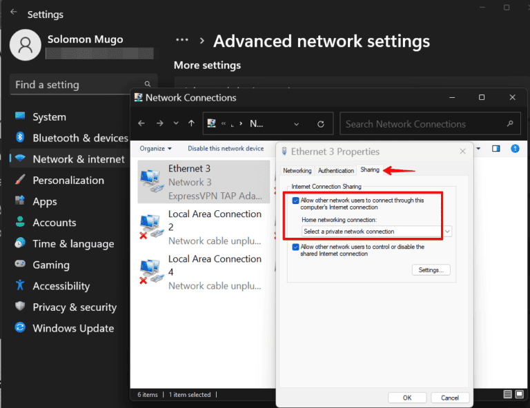 - 在下面 ”分享,“ 打鉤 ”允許其他網絡用戶通過此計算機的 Internet 連接進行連接”。然後,單擊“好的”。