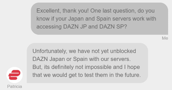 不幸的是,ExpressVPN的實時聊天支持證實了他們的日本和西班牙服務器目前尚未針對解散DAZN JP或DAZN ES進行優化。