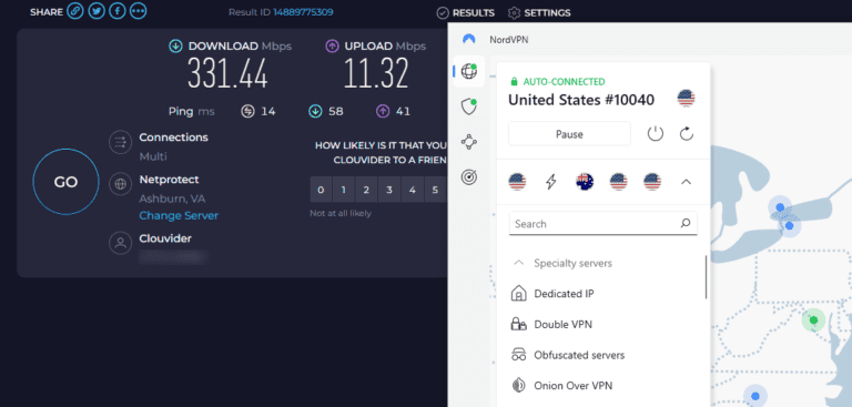 連接到最近的服務器(弗吉尼亞州馬納薩斯)上的 NordVPN 後,我的速度降低了大約 31%: