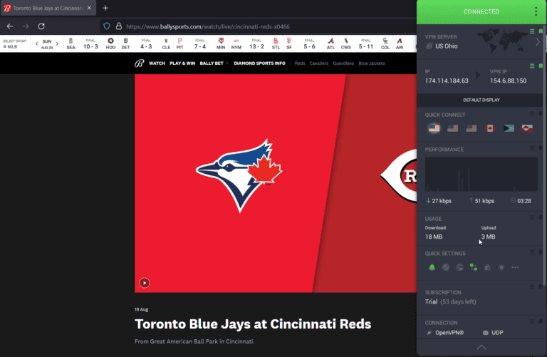 私人互聯網接入您可以連接到俄亥俄州服務器以解鎖本地內容並流式傳輸辛辛那提紅隊和多倫多藍鳥隊的直播比賽。