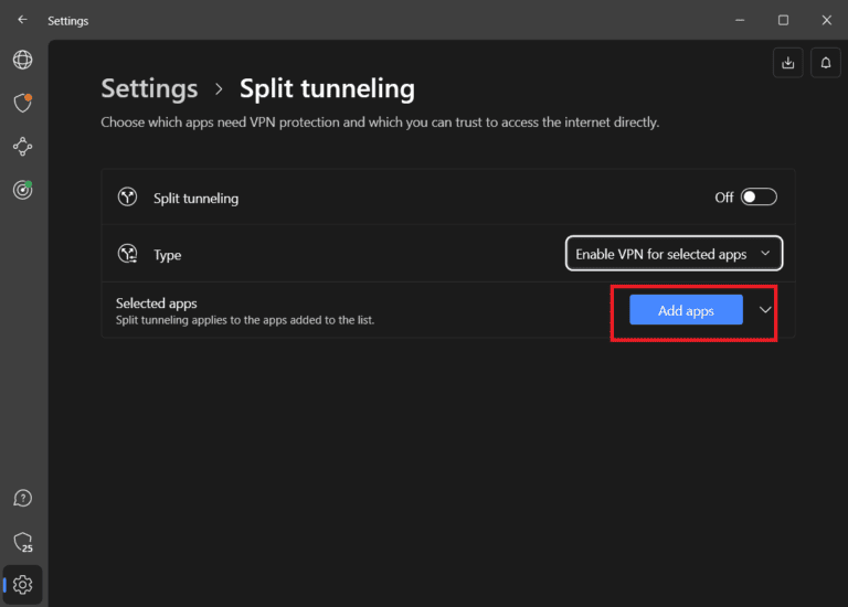- 為選定的應用程序啟用 VPN– 僅選擇少數應用程序/程序與 VPN 配合使用的最佳選擇。