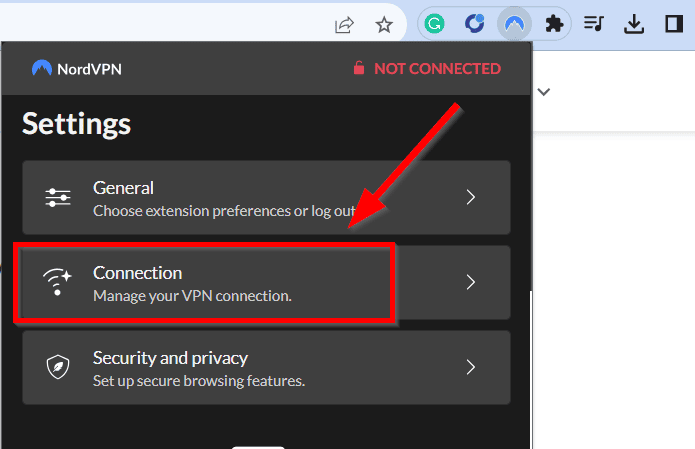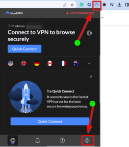 - 單擊NordVPN 擴展圖標,然後單擊設置圖標。