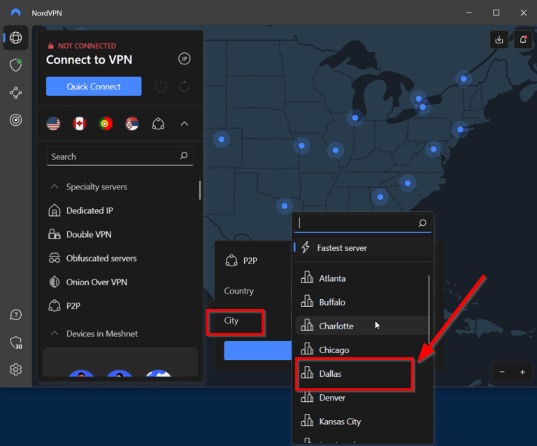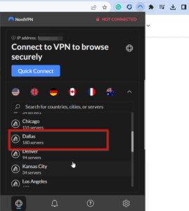 - 搜尋"達拉斯”。這是 NordVPN 上唯一的德克薩斯州服務器位置。