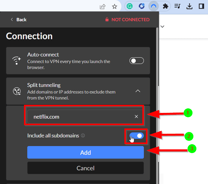 - 切換“包括所有子域”以確保 NordVPN 不會加密連接/更改任何網站變體上的 IP 地址。
