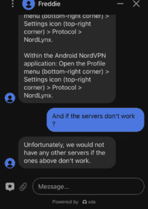 支持代理商確認只有Nordlynx方案有效,並使用特定的比利時,荷蘭或希臘服務器建議。