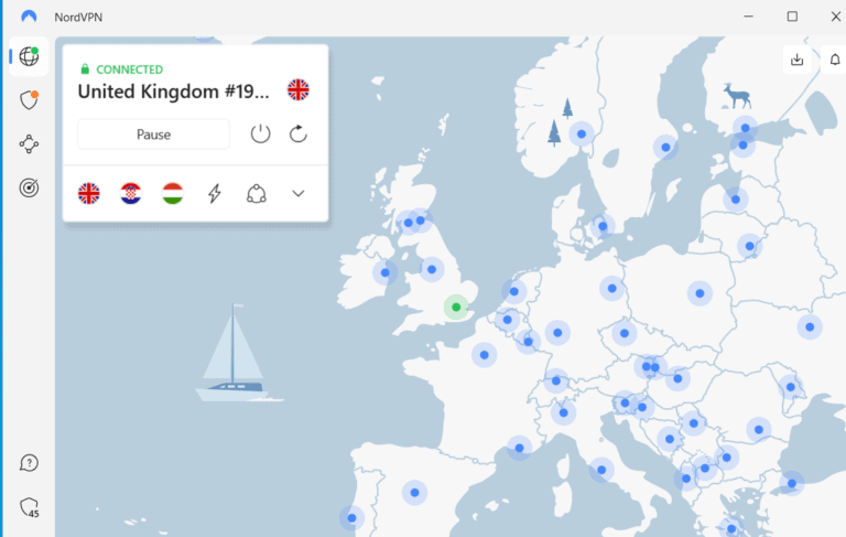 - 等待它連接到VPN服務器,僅此而已!您可以在歐洲安全使用NordVPN呢如果歐洲服務器之一(例如,英國)不起作用,請嘗試另一個或連接到附近國家的服務器。