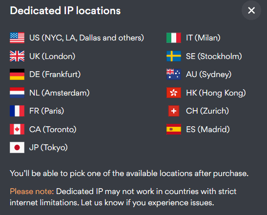 購買計劃後,根據您的需求選擇您的歐洲專用IP位置。例如,如果您需要專用的IP地址來解鎖英國資源,請選擇NordVPN的倫敦專用IP。