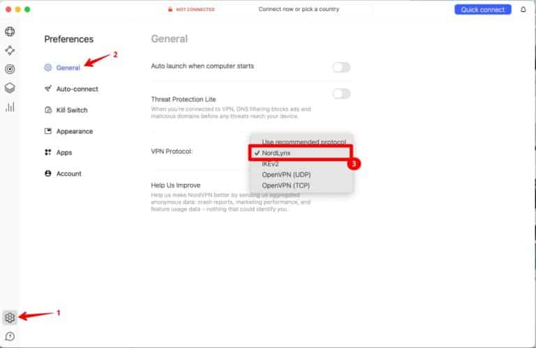 - 單擊設置圖標, 選擇 ”一般的,”,然後單擊“VPN協議”。選擇 ”北山貓” 從下拉菜單中。