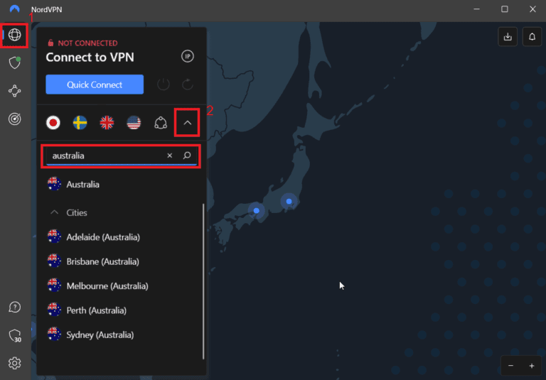 - 選修的:單擊下拉菜單搜索首選 NordVPN 服務器。然後,單擊服務器進行連接。