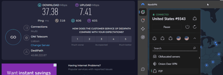 我進行了第三次測試,並允許 NordVPN 為我選擇最快的 P2P 美國城市服務器。它為我分配了一個記錄 37.38 Mbps 的區域!這是針對 30 Mbps 網絡的測試,表明 NordVPN 可以釋放您網絡的真實速度 - 不受限制!