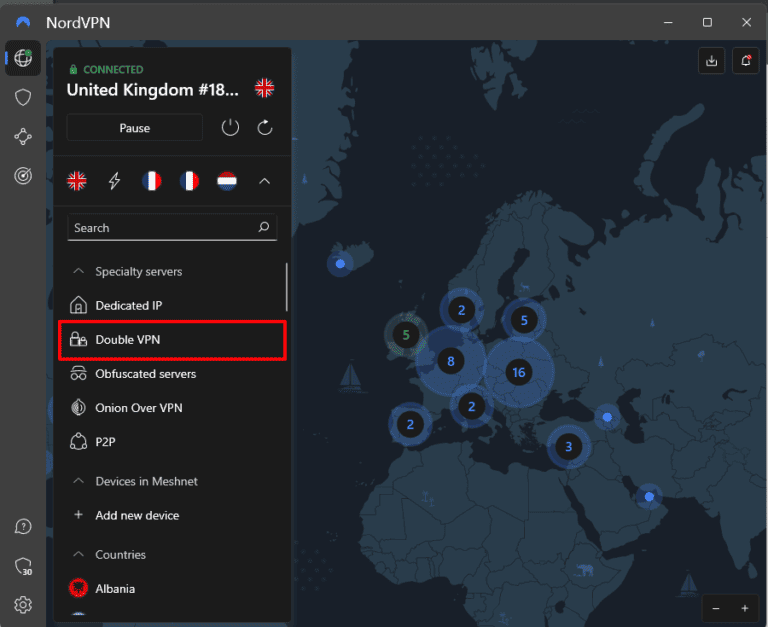 這雙VPN是一項高級 NordVPN 安全功能,可通過兩個獨立的 VPN 服務器路由您的互聯網流量,對您的 IP 地址和互聯網流量進行兩次加密。
