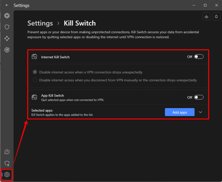 在 Windows 上,NordVPN 提供兩個終止開關選項(互聯網和應用程序),保護您的機密信息在 Wi-Fi 網絡之間切換時,來自秘魯政府、Claro 和惡意威脅者的攻擊。
