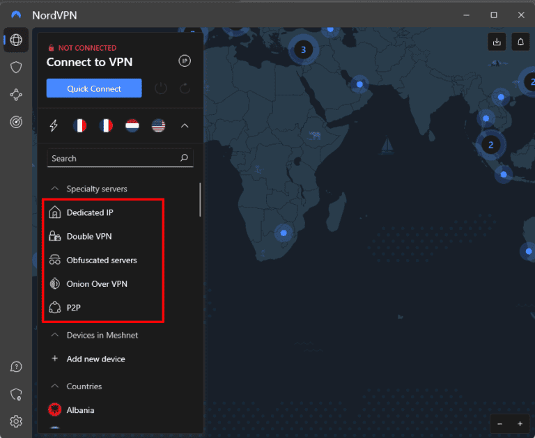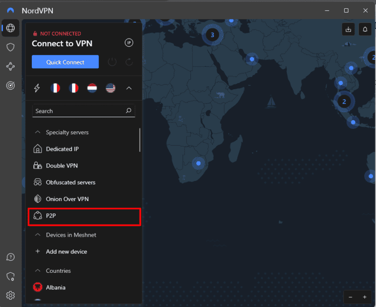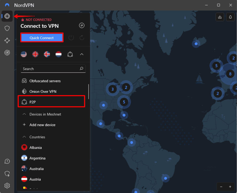 - 選擇適當的 NordVPN 服務器位置並連接。單擊地球圖標可查看所有 NordVPN 服務器的列表。或者,單擊“快速連接” 最快/最近的服務器或“對等” 最佳流媒體或遊戲服務器。
