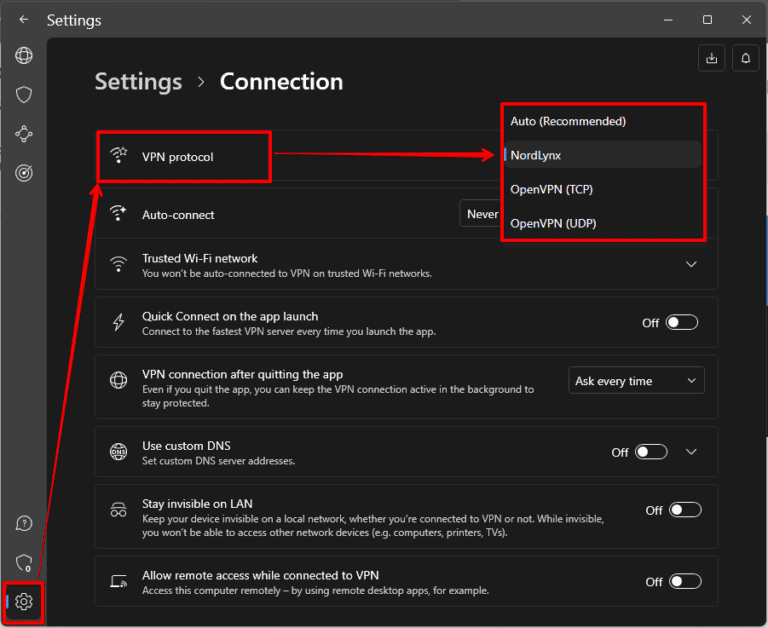 - 選擇合適的連接協議。我推薦 NordLynx 協議,因為它在速度和安全性方面具有出色的平衡。要激活 NordLynx,請轉至設定>連接>VPN協議。