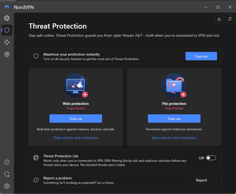 威脅防護是一種先進的 NordVPN 安全解決方案,可保護您免受網絡跟踪器,受惡意軟件感染的文件,惡意廣告,和有害場所。