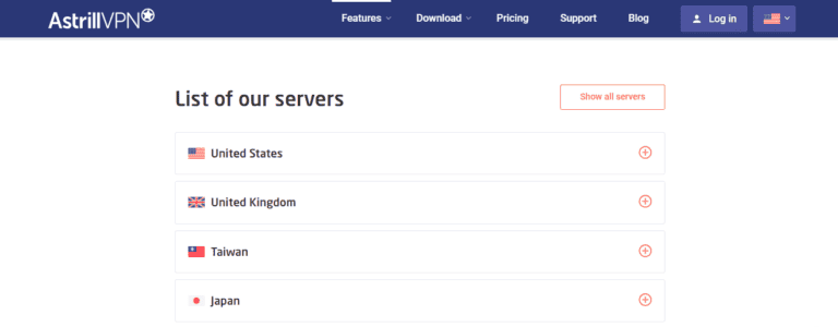 - 超負荷的服務器:AstrillVPN 擁有廣闊的服務器網絡,包括香港、台灣和日本的附近服務器。這些服務器為中國用戶提供快速的互聯網連接,同時又不犧牲安全性。