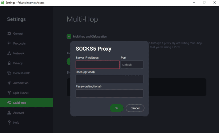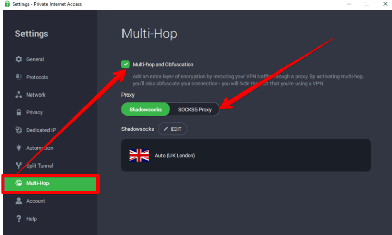 - 打開您的 PIA 應用程序,單擊“多跳,”並檢查“多跳和混淆”。然後,切換到“SOCKS5代理”。