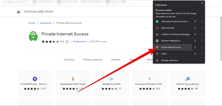不過,由於中國不允許使用 Chrome、Firefox 和 Edge 等瀏覽器,因此您可能必須下載 Google 的中文版 Chrome。完成後,您可以下載 PIA 擴展並單擊紅色圖標輕鬆連接。