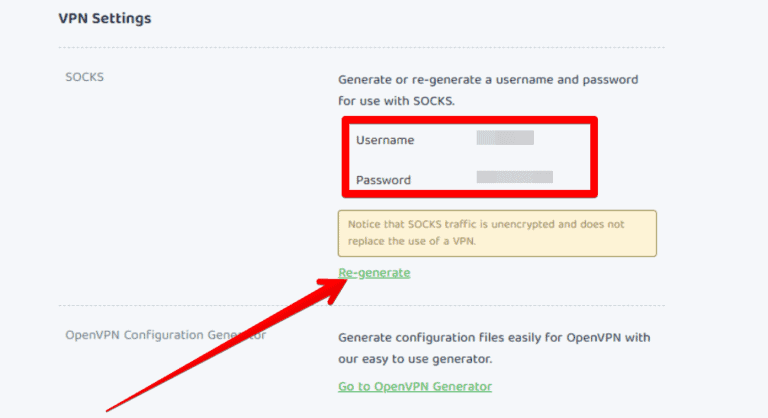 - 點擊 ”生成/重新生成” 來獲取您的用戶名和密碼。請記住確保兩者安全,因為它們與您的 PIA 登錄詳細信息不同。