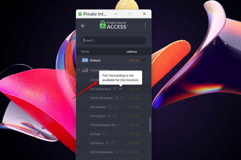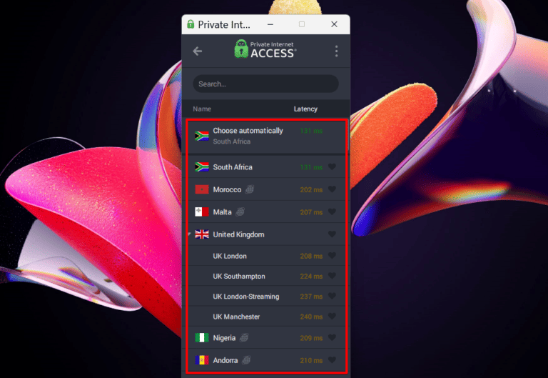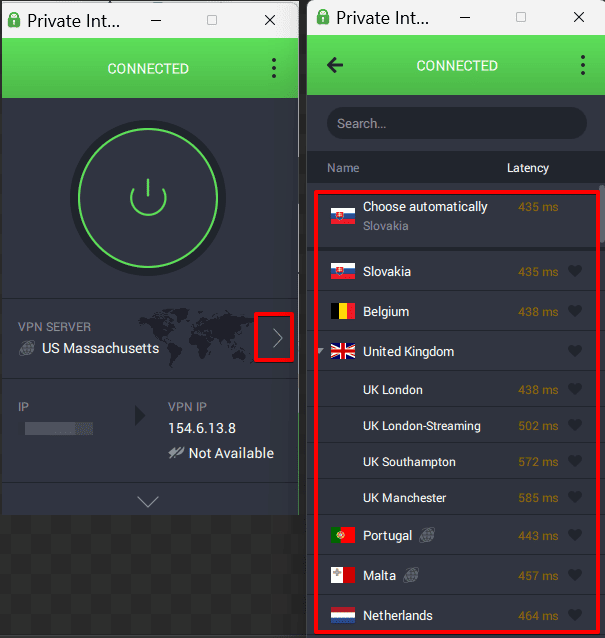 - 搜索首選 PIA VPN 服務器位置。單擊以選擇它。