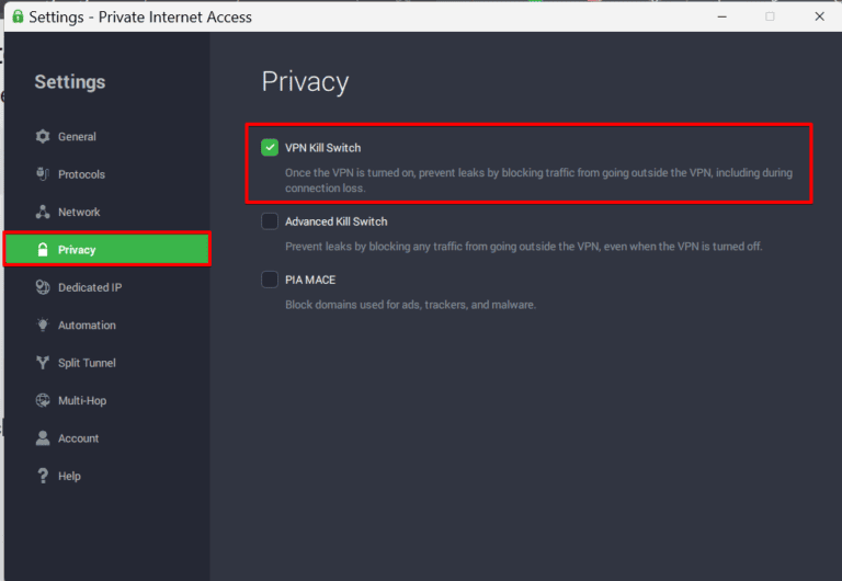 - 啟用設定終止開關。如果 PIA 連接在馬卡蒂的 Laqui's Bakery 或長灘島的 Marquis Hotel 等不受信任的 WiFi 網絡上突然斷開,這會向惡意行為者隱藏您的真實 IP 和互聯網活動。