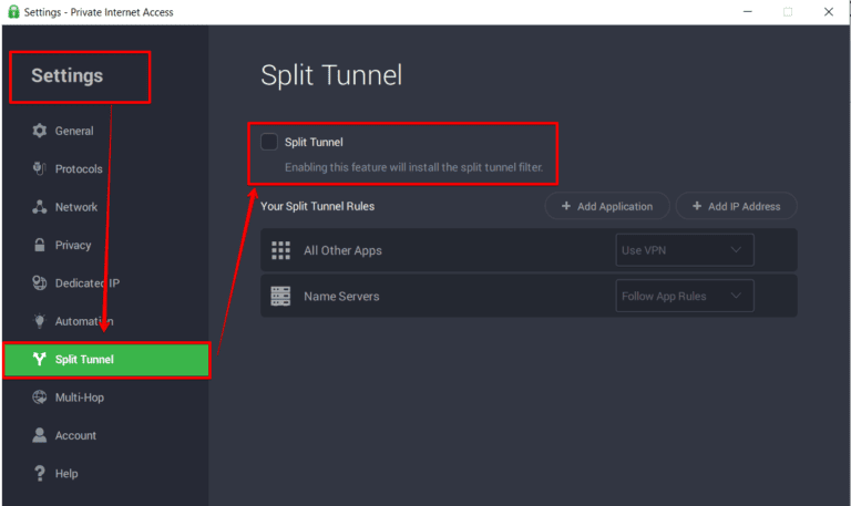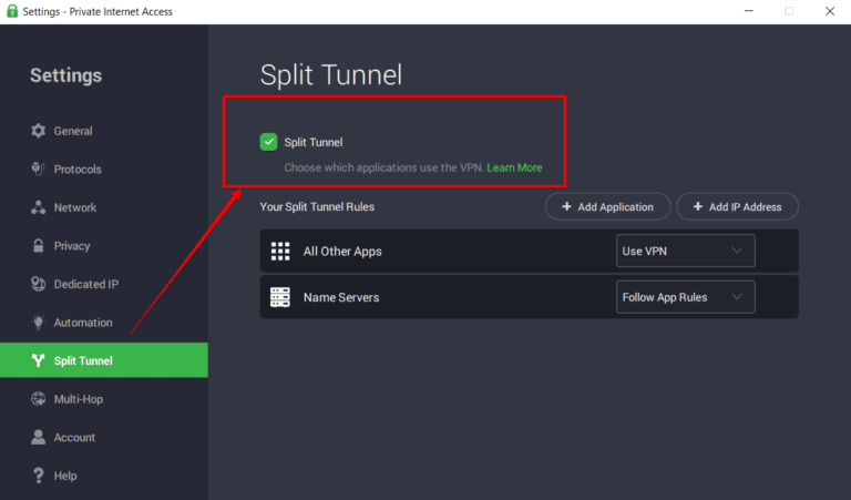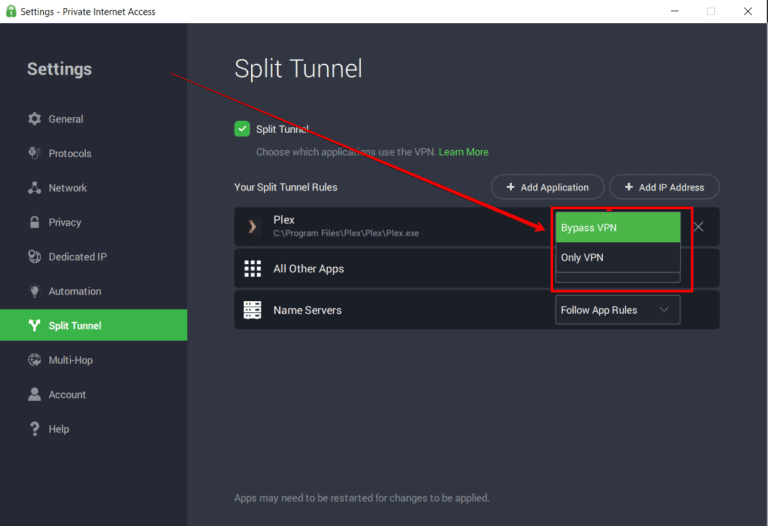 - 使用分割隧道:您可以通過 PIA VPN 連接路由特定應用程序或設備,從而為您的 Plex 應用程序釋放帶寬。或者,如果您當時不需要 PIA,則將 Plex 傳遞到 VPN 之外。