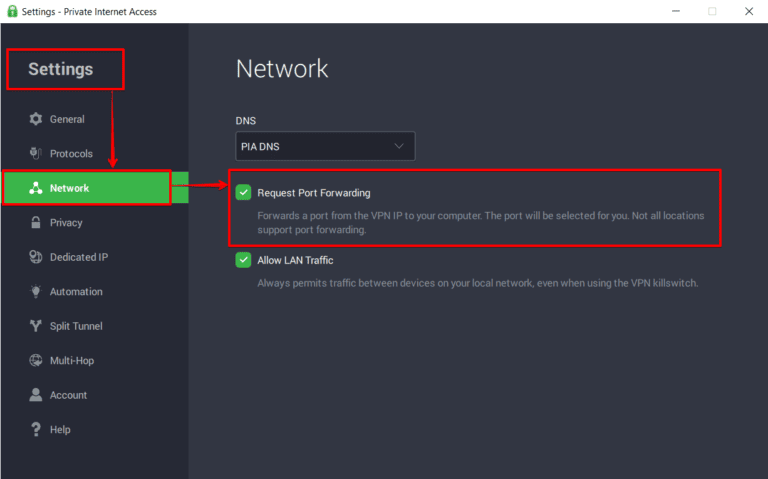 - 導航至設定>網絡並打開“請求端口轉發”。