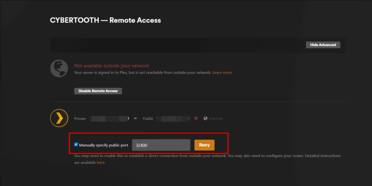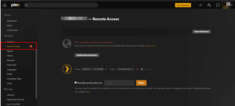 - 使能夠遠程訪問在 Plex 上通過設定>遠程訪問>顯示高級。