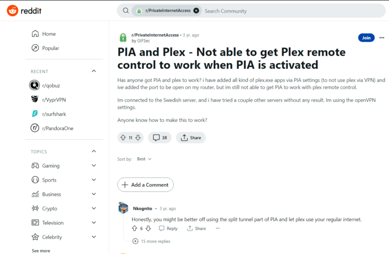 對於想要在 Plex 媒體播放器上流式傳輸內容的任何人來說,私人互聯網接入是一個絕佳的選擇。然而,Reddit 的評論顯示,一些用戶使用 PIA Plex 組合時遇到問題。