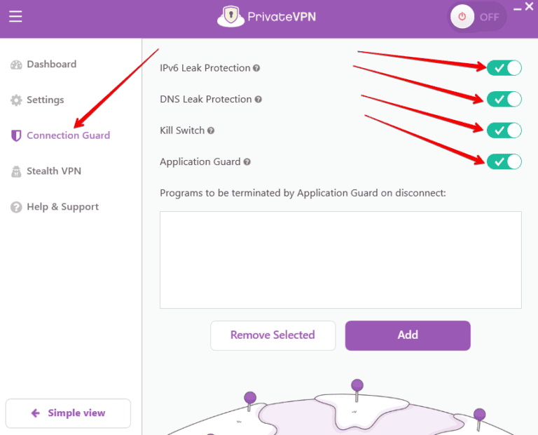 - 選修的:打開“應用衛士”如果您通過 PrivateVPN 使用特定的流媒體或遊戲應用程序。