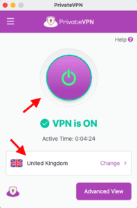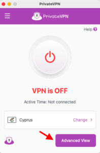 - 點擊 ”高級視圖” 在您的 PrivateVPN 應用程序的右下角查看更多選項。
