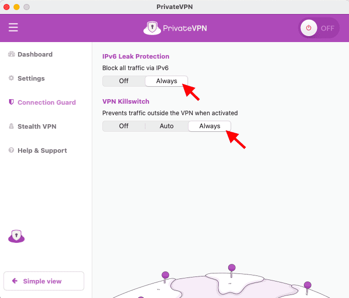 - 打開 ”連接衛士”從側邊欄。打開終止開關和IPv6保護。