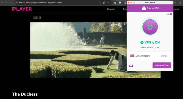 - 就這樣吧!使用 PrivateVPN 享受安全的互聯網和地理鎖定的內容。我在連接到 PrivateVPN 時在 BBC iPlayer 上播放了《公爵夫人》英國-曼徹斯特服務器。