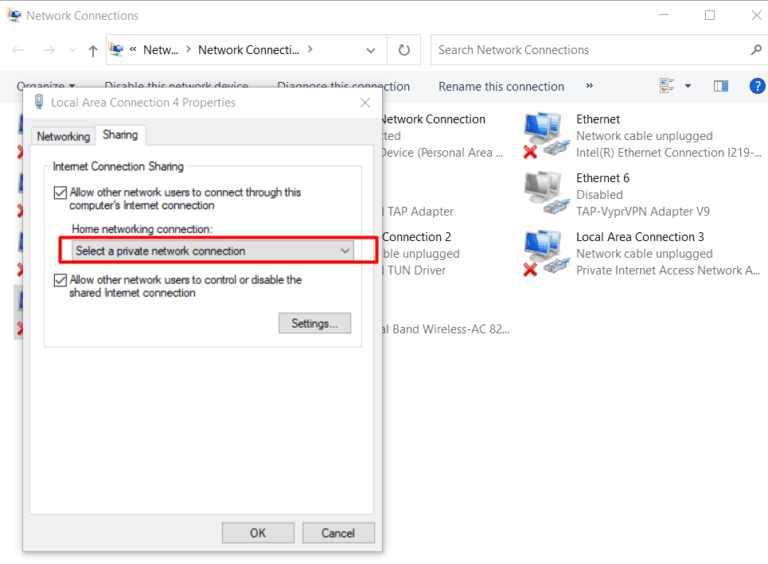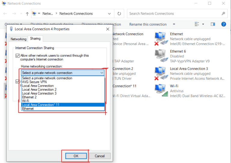 - 從下拉菜單中選擇您的移動熱點連接,通常名為“本地連接* [#],”然後單擊“好的”。