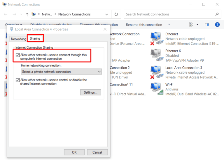 - 選擇 ”分享,”然後選中“旁邊的框允許其他網絡用戶通過此計算機的 Internet 連接進行連接”。