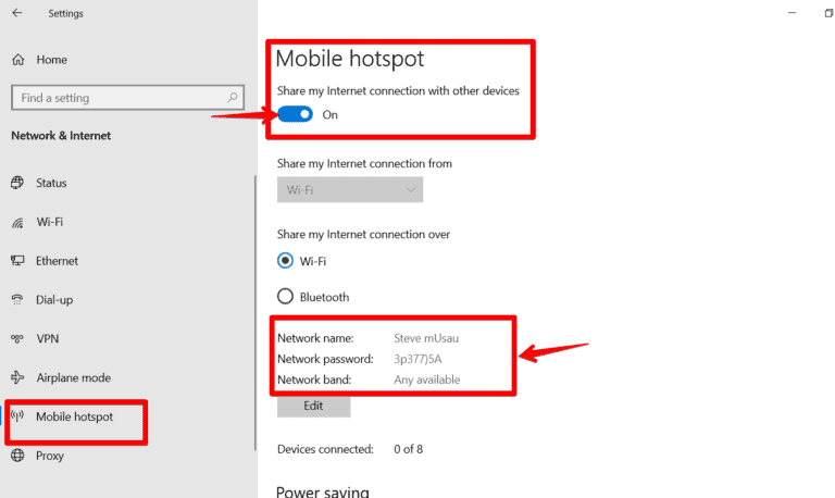 - 導航至“移動熱點”並打開移動熱點按鈕。記下“網絡名稱”和“網絡密碼”。