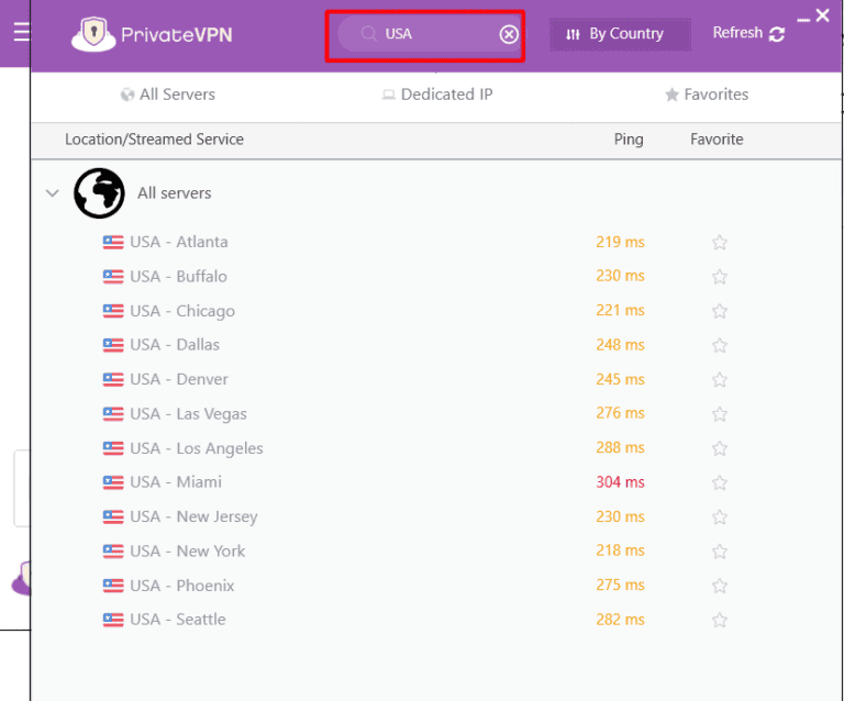 - 在 VPN 搜索欄上輸入您的首選服務器國家/地區。我會選擇美國。