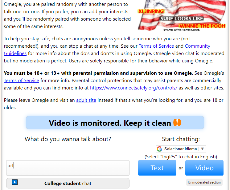 - 接下來,我在瀏覽器上打開Omegle,繼續完成“你想談什麼” 出現在主頁上的部分(我輸入了“藝術”)。然後我單擊了“文字”。