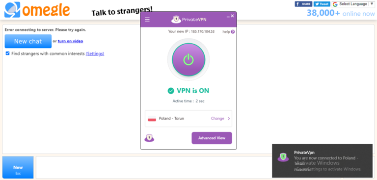 客戶支持確認 PrivateVPN 可與 Omegle 配合使用,但它可能脾氣暴躁,選擇合適的服務器是關鍵。