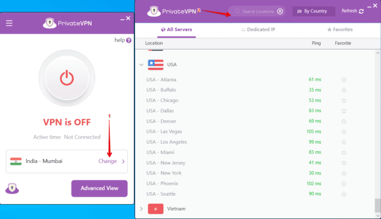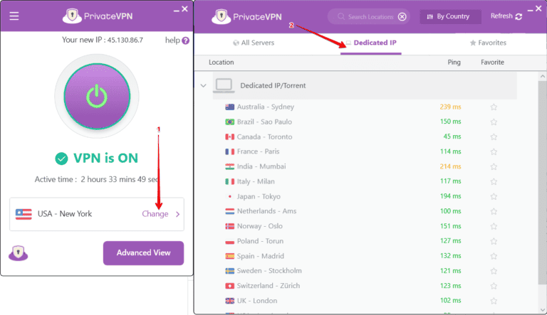 要使用 PrivateVPN 的專用 IP,請單擊改變>專用IP並在 PayPal 支持的區域中選擇您所需的專用 IP 服務器。