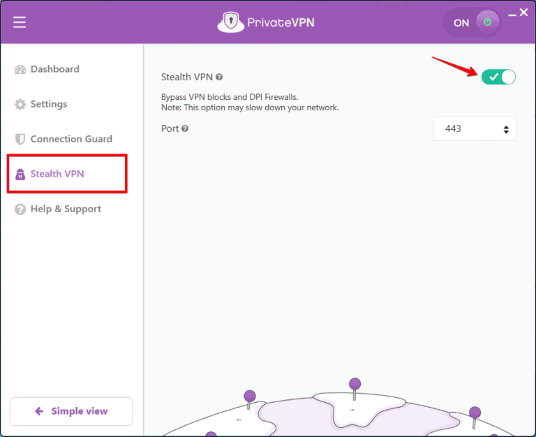 通過單擊設置 PrivateVPN 的 Stealth VPN 功能高級視圖 > 隱形 VPN並切換“隱形VPN“ 在。
