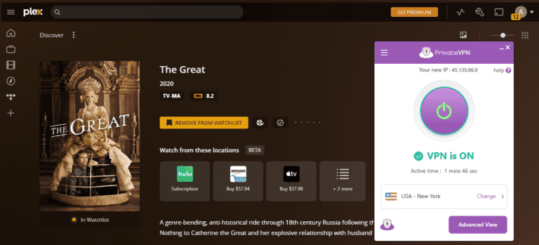 為了測試這一點,我首先嘗試在不連接 PrivateVPN 的情況下在 Plex 上觀看 The Great。