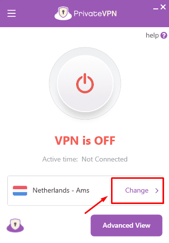 - 導航到應用程序的主屏幕並選擇“改變” 查看 PrivateVPN 的服務器列表。