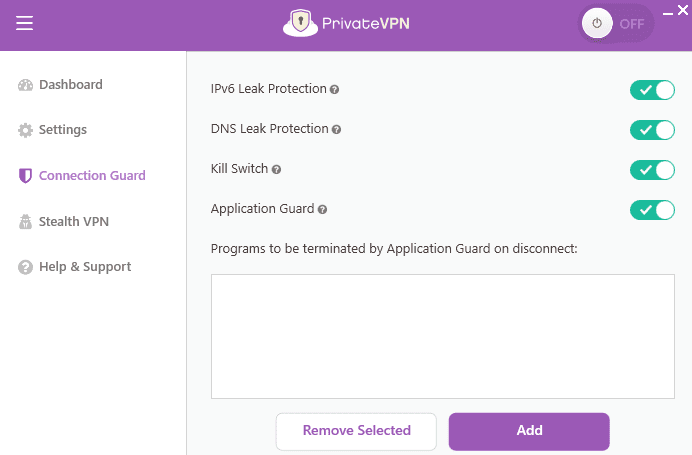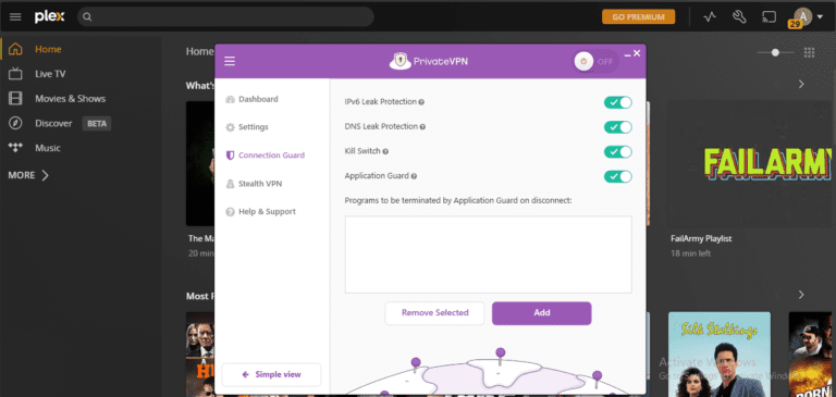 在使用 VPN for Plex 之前,請確保在“Connection Guard”下啟用 PrivateVPN 的 IPv6 洩漏保護、DNS 洩漏保護、終止開關和應用程序防護。這將加強您連接到 Plex VPN 時的隱私。