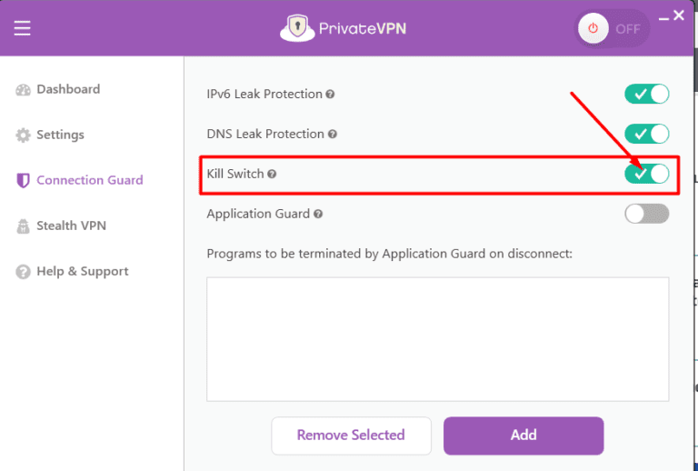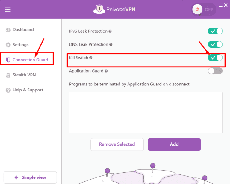 - 啟用終止開關。前往高級視圖>連接衛士> 然後切換終止開關按鈕。
