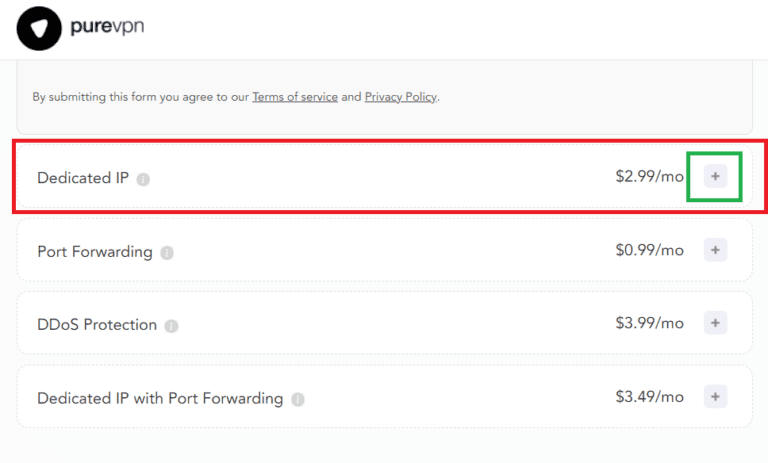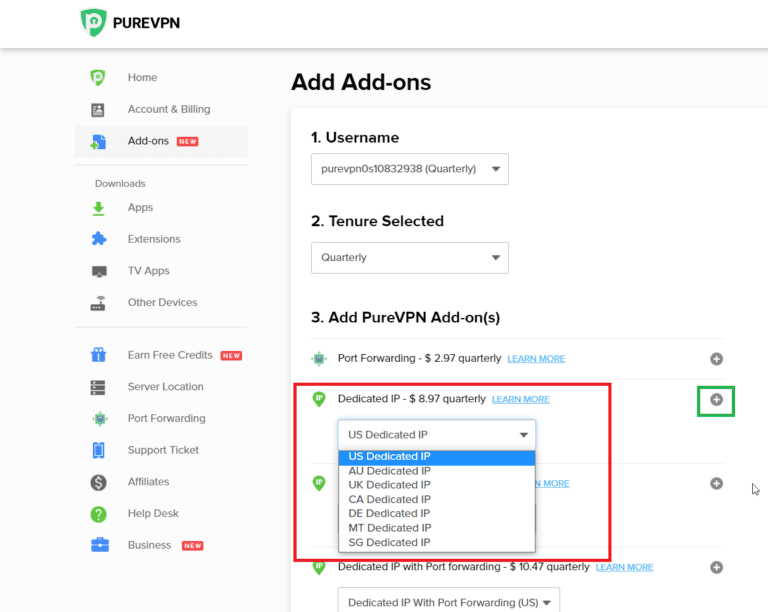 您可以通過在首次購買 VPN 時將其選擇為附加組件來獲取 PureVPN 的專用 IP 地址,或者如果您已經擁有 VPN,則可以從帳戶儀表板中獲取 PureVPN 的專用 IP 地址。