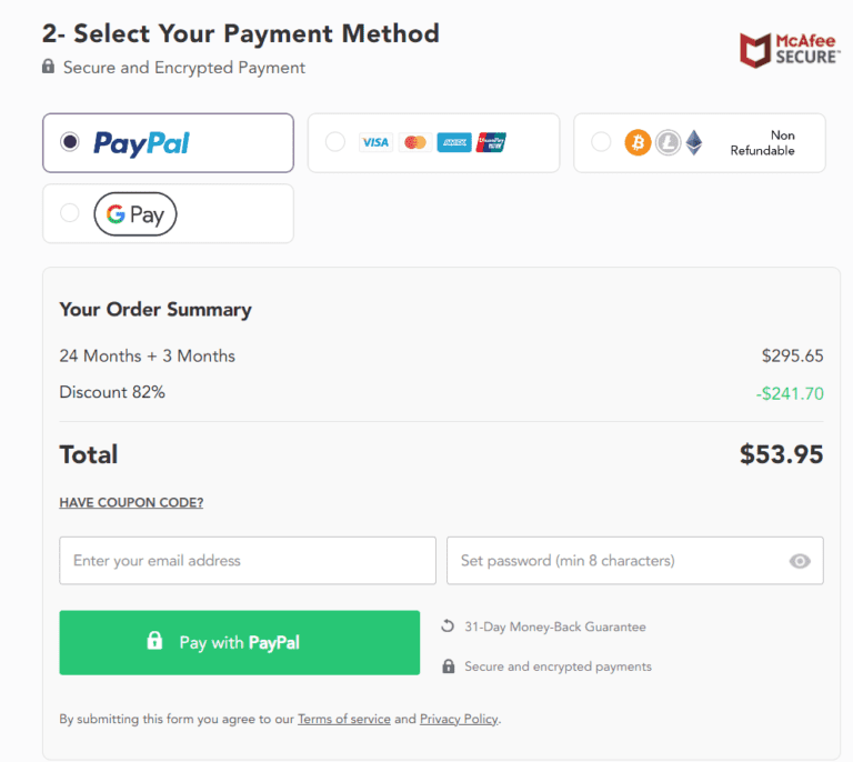 - 選擇您喜歡的付款方式。 PureVPN 支持 PayPal、信用卡、Google Pay 和加密貨幣。