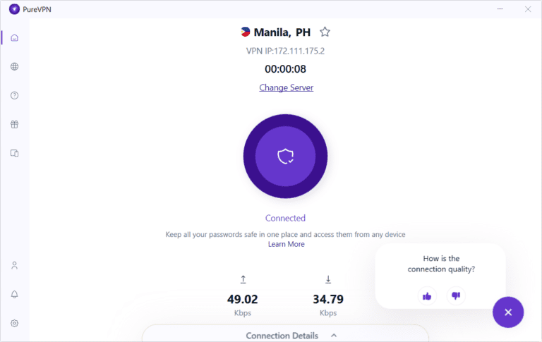 PureVPN 在菲律賓效果很好甚至誇耀馬尼拉的服務器允許國外的菲律賓人獲得本地 IP 地址,以繞過地理限制、解鎖網站並在任何地方享受本地內容。