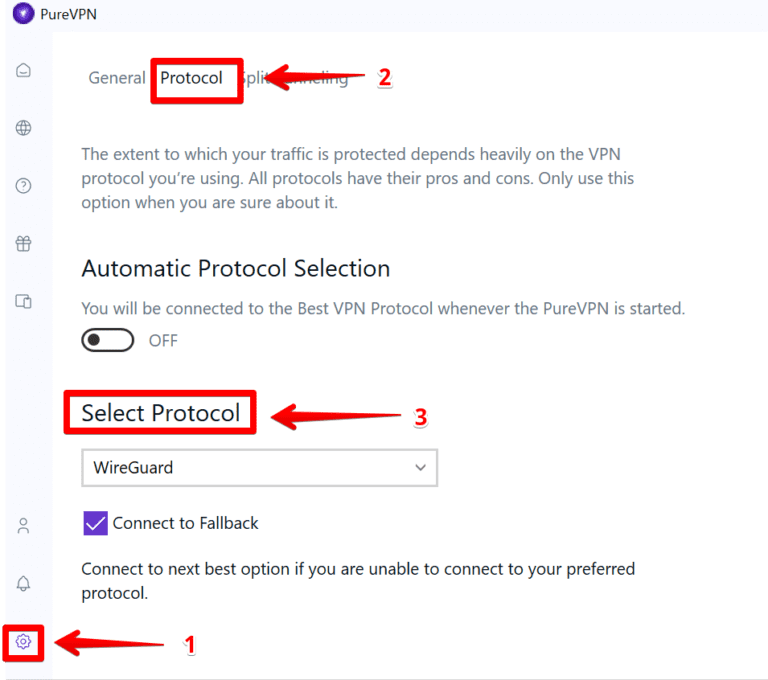 - 選擇正確的協議。你應該經歷設定>協定>選擇協議。我推薦 WireGuard,因為它快速且高度安全。