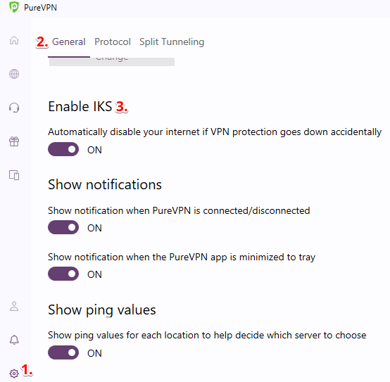 選擇設定>一般的>啟用 IKS在您的 PureVPN VPN 應用程序上執行此操作。